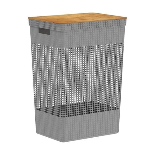 Cesto de Roupa Grid Chumbo 49 L com Tampa de Bambu 38 x 28 x 55,6 cm - Na sua casa