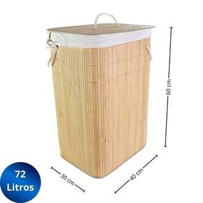 Material: Bambu, polipropileno e açoDimensões:Altura: 60cmLargura: 40cmProfundidade: 30cmCapacidade: 72 litrosPeso Aproximado: 1,5kg