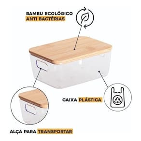 Multiuso, versátil, para organizar diversos ambientes, como a despensa da cozinha, os armários do banheiro, o closet, materiais do home office. com tampa de bambu, material que evita mofo e bactérias. Possui encaixe para as mãos, para facilitar o manuseio. facilidade para visualizar os objetos. Praticidade e de fácil limpeza, recomendado usar detergente neutro e pano macio.
