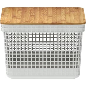 O Cesto Organizador Grid Com Tamp De Bambu possui medidas de 29cm-profundidade x 23cm-largura x 15,6cm-altura Capacidade de 8 litros.Além de possuir tampa em bambu que traz um toque a mais de sofisticação e elegância para qualquer ambiente da sua casa.Cor Bege SUSTENTABILIDADEProduzido de plástico 100% pós-consumo, proveniente de resíduos coletados do litoral brasileiro, com o objetivo de evitar que esse plástico chegue ao mar ou rios da região.DesignDesign minimalista, cores neutras, acabamento fosco, três elementos essenciais para a sofisticação. Diferentes TamanhosA linha traz diferentes tamanhos em seus produtos, adequando-se as necessidades de organização durante o dia a dia. Conteúdo da Embalagem1 cesto com tampa Especificações Técnicas: Altura15.6cmLargura23cmProfundidade29cmPeso668g