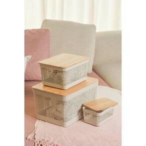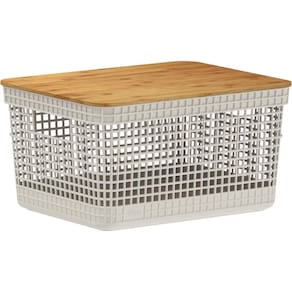 O Cesto Organizador Grid Com Tamp De Bambu possui medidas de 29cm-profundidade x 23cm-largura x 15,6cm-altura