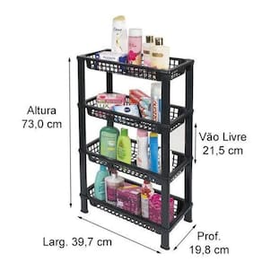 Arrume os objetos com muita praticidade Este organizador possui 4 prateleiras, com capacidade máxima para 1,5 kg. Pode ser usado na área de serviço ou na lavanderia de sua casa, armazenando os produtos de limpeza, cosméticos, itens de higiene e beleza, ou o que mais você precisar. Perfeito para colocar naquele espaço obsoleto do ambiente.