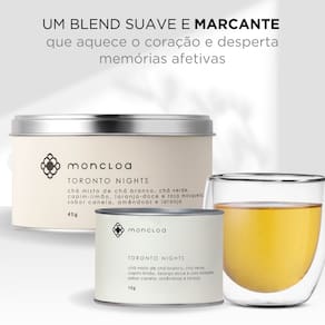 O Toronto Nights combina chá branco e chá verde com capim-limão, laranja-doce, amêndoas e delicadas notas de canela. O resultado é uma infusão aromática e encorpada, com equilíbrio entre o cítrico e o amendoado.