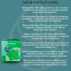 Digestivo: A hortelã é conhecida por suas propriedades digestivas, ajudando a aliviar azia, náuseas, indigestão e gases. O chá é ideal para ser consumido após as refeições, promovendo uma digestão mais leve e confortável. Refrescante: O sabor mentolado da hortelã proporciona uma sensação refrescante e revigorante, ideal para se refrescar em dias quentes.