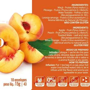 Chá misto de pêssego maçã mate tostado e laranja cx. Com 10 sachês 10 envelopes. Peso liquido: 10g maçã - frutos pyrus malus l. ; pêssego - frutos prunus persica l. batsch ; mate tostado - folhas e talos ilex paraguariensis st. Hil. ; laranja-amarga - frutos citrus aurantium l. ; aroma idêntico ao natural de pêssego. não contém glúten. Modo de preparo: coloque 1 sachê de chá para cada xícara, despeje água quente não fervente e deixe em infusão até o sabor e o aroma ficarem a seu gosto. - sem adição de açúcares. - zero calorias. - não contém glúten.