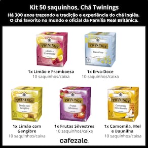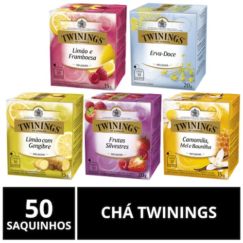 Desde 1706 levando a deliciosa experiência do chá inglês para a sua mesa. Os apreciadores de chás do mundo inteiro são unânimes em afirmar que eles são os melhores que existem. Por mais de 300 anos, os especialistas da Twinings têm elaborado chás de alta qualidade provenientes de regiões do mundo inteiro. Muita tradição e sabor. A cada semana, nossos Master Blenders degustam mais de 4.200 xícaras de chá. São eles quem garantem a qualidade dos chás Twinings e que desenvolvem os novos e fascinantes sabores de chá.Em 1837, a Rainha Vitória concedeu à Twinings sua primeira Autorização Real para chás, tornando-a fornecedora oficial de chás da Família Real Britânica, até o presente. Os chás Twinings são encontrados atualmente em mais de 115 países e lideram a categoria de chás premium.Sobre o Chá TwiningsA marca de chá favorita no mundo.Chá oficial da Família Real Britânica. Produto importado, fabricado na Europa. Muita tradição e sabor. Mais de 300 anos de história. Conteúdo 5 caixas com 10 saquinhos de chá. Sabores1x Camomila e BaunilhaEsta infusão traz a combinação do delicado sabor da camomila com o doce da baunilha. Seu aroma é inesquecível e uma xícara é capaz de perfumar o ambiente.Ingredientes: Capítulos florais de camomila e aromatizantes. CONTÉM GLÚTEN.1x Limão com GengibreNós unimos dois dos ingredientes mais apreciados no mundo para criar nosso sabor mais vendido: o gengibre e o limão, trazendo esta infusão revigorante com um aroma cítrico e um sabor picante ao mesmo tempo. Ingredientes: Rizomas de gengibre, frutos de maçã, frutos de rosa-silvestre, cascas de limão, folhas de laranja, aromatizantes e acidulante ácido cítrico. NÃO CONTÉM GLÚTEN.1x Frutas SilvestresUma das infusões mais queridas de Twinings pelos brasileiros, este blend traz uma combinação exclusiva de frutas e flores do campo. Laranja, maçã, morango e framboesa unem-se ao hibisco e à rosa-silvestre para criar um sabor frutado intenso e surpreendente. Ingredientes: Flores de hibisco, folhas e cascas de laranja, frutos de maçã, frutos de rosa-silvestre, frutos de morango, frutos de framboesa e aromatizantes. NÃO CONTÉM GLÚTEN.1x Erva-DoceAo secar as flores de erva-doce, elas liberam centenas de minúsculas sementes, revelando seu sabor envolvente. Na Twinings, selecionamos com cuidado as sementes que você encontra em cada saquinho desta infusão. Produzido somente com ingredientes naturais, não contém cafeína. Ingredientes: Frutos de erva-doce nacional. CONTÉM GLÚTEN.1x Limão e Framboesa Infusão exclusiva da Twinings, combinamos aqui dois sabores cítricos para uma experiência super refrescante: limão e framboesa. Seu aroma é incomparável e ela é perfeita para ser consumida quente na xícara ou fria com muito gelo durante o verão.Observações Validade: 24-36 MesesFabricado na Polônia.