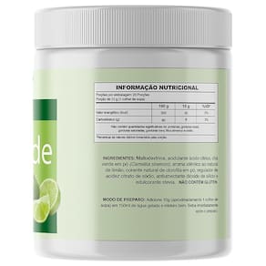 INGREDIENTES: Maltodextrina, chá verde em pó (Camellia sinensis), acidulante ácido cítrico, regulador de acidez: citrato de sódio, clorofila em pó, edulcorante stévia, antiumectante dióxido de silício e aroma idêntico ao natural de limão. NÃO CONTÉM GLÚTEN