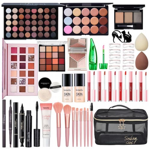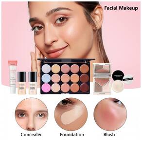 Kit Completo de Maquiagem All in One da CHAFFUL oferece tudo que você precisa para sua rotina diária de beleza: base, primer facial, paleta de sombras, paleta de contorno, paleta de corretivos, gloss labial, batom em gel, pó solto, pó para sobrancelha, esponjas, batons, delineador, estênceis para sobrancelha, rímel, conjunto de pincéis profissionais e uma prática bolsa para transporte. Ideal tanto para iniciantes quanto para entusiastas experientes, este kit atende perfeitamente todas as suas necessidades diárias de maquiagem.
