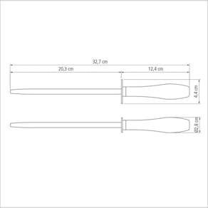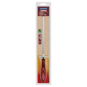 A haste de aço carbono revestida com cromo-duro que garante uma maior durabilidade e precisão para a afiação. O cabo de madeira tratada Polywood é resistentes à impactos e alta temperaturas garantindo maior resistência e durabilidade. O cabo ergonômico proporciona maior segurança, equilíbrio e conforto. A chaira possui um protetor para a mão do usuário. Pode ir à máquina de lavar louças facilitando seu dia a dia.