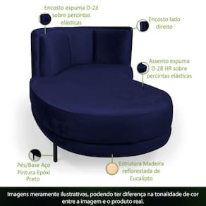 Chaise Direito Sala De Estar Penélope Base Preto Veludo Azul Escuro - Nexta Casa Descrição do Produto A Chaise Penélope tem um design único encantadora, além da sua beleza estética proporciona maciez e aconchego inigualável. Sua estrutura é desenvolvida com madeira reflorestada de eucalipto que tem sinônimo de qualidade, com pés e base em aço que garante maior resistência ao produto, e pensando no bem-estar dos nossos clientes foi confeccionada com espumas D-28 e D-23 que ao sentar transmitirá conforto deixando você e os seus convidados apaixonados. A Chaise Penélope se encaixa perfeitamente em qualquer tipo de ambiente, é uma peça que combina com diversas cores e decorações. Aproveita e Garante já a sua! Dimensões do Produto: Altura: 82 cm Largura: 163 cm Profundidade: 100 cm Peso: 35 Kg