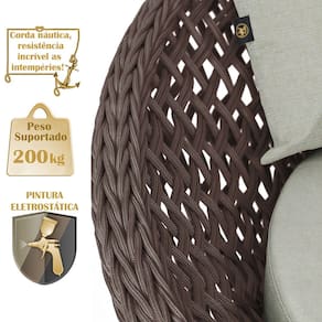 A trama artesanal em corda náutica adiciona um toque moderno e elegante, além de proporcionar flexibilidade e conforto inigualáveis. Para completar, o estofado em tecido impermeável assegura praticidade e bem-estar em qualquer ambiente, seja na área externa ou interna.