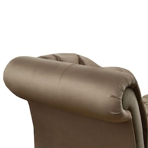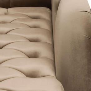 Ele possui estofamento e costura em capitonê e pés de madeira clássicos. Além de ser confortável, tornando-o perfeito para leitura, atendimento a clientes ou momentos de lazer.