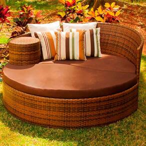 ESPECIFICAÇÕES TÉCNICAS: Chaise Meia-Lua - Altura: 75 cm - Diâmetro: 160 cm - Acompanha 2 almofadas de assento - Acompanha 5 almofadas soltas - Suporta até 300 kg