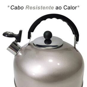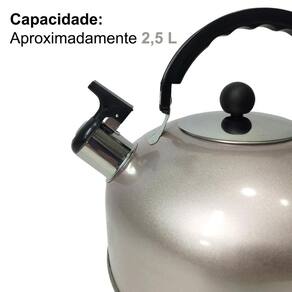 - modelo: chaleira com apito - material: aço inox e polipropileno - medidas: 22 x 24 - capacidade: 2,5 litros - cabo resistente ao calor - estrutura em aço inoxidável - designer ergonômico
