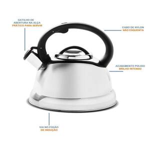 Chaleira Com Apito Indução 2,7 Litros Roma 4875 Inox- Brinox INFORMAÇÕES DO PRODUTO Com design elegante e sofisticado, a Chaleira com apito de aço inox da linha Roma Brinox tem 2,7 litros de capacidade e conta com exclusivo fundo de indução que pode ser usado em qualquer tipo de fogão. Seu acabamento polido, traz brilho intenso ao produto. Resistente e fácil de limpar, a Chaleira possui cabo de nylon que não esquenta, deixando o manuseio do produto mais seguro e tranquilo, o gatilho de abertura na alça traz mais praticidade na hora de servir, proporcionando conforto e segurança. Esta versão disponível vai trazer mais modernidade à sua cozinha. Todas as características que compõem esse produto foi desenvolvido para você que busca conforto e rapidez na hora de fazer suas receitas. ESPECIFICAÇÕES:- Marca: Brinox- Cor: Inox- Linha: Roma- Formato: Redondo- Design: elegante- Material: Aço inox- Material do cabo: nylon- Acabamento: polido- Capacidade: 2,7 litros- Possui apito: sim- Tipo de fundo: indução- Conteúdo da embalagem: 01 chaleira e manual- Dimensões aproximadas da embalagem: 24 x 23 x 25cm- Peso aproximado da embalagem: 0,800kg Atenção: pode ser utilizado em qualquer tipo de fogão Ean: 7896502844005