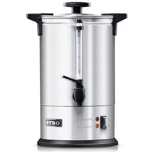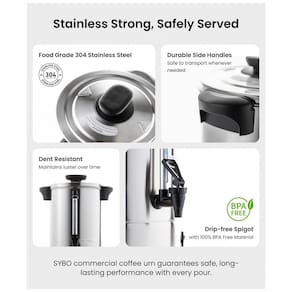 Chaleira comercial em aço inoxidável 304 de grau alimentício, com capacidade de 18 litros (120 xícaras). Possui bico anti-gotejamento, indicador visual de nível de água, base antiderrapante e filtro reutilizável. Certificada ETL pela Intertek.Acessórios