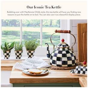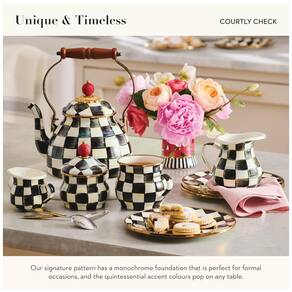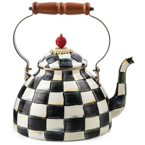 Chaleira de chá cortês com uma alça de madeira e uma tampa encimada por uma conta de cinábrio esculpida, esta chaleira xadrez está vestida com esmero A parte inferior da carroceria de aço de bitola pesada é envidraçada com cheques coloridos pintados à mão em preto e branco. Chaleira de chá exclusiva oferecemos nossa linda chaleira em uma variedade de cores e padrões. Esteja você desfrutando de uma xícara de chá casual à tarde ou dando uma festa elegante, você pode tornar cada dia extraordinário com MacKenzie Childs. CONJUNTO DE COZINHA DE ESMALTE Combine sua adorável chaleira para uso no fogão com nossa grande variedade de peças de louça Oferecemos canecas de café combinando, pratos de jantar e salada e muito mais. Desfrute de padrões únicos e visuais impressionantes com MacKenzie Childs. UM PRESENTE PERFEITO A clássica chaleira esmaltada da MacKenzie Childs é muito mais do que um presente é o começo de uma coleção para toda a vida. É um presente incrível de Natal, aniversário, casamento ou inauguração de casa. MACKENZIE CHILDS A MacKenzie Childs nasceu do nosso amor pelo lar e do nosso compromisso com um design e inovador. Cada peça criada por nossos artesãos guarda a surpresa e a alegria do inesperado
