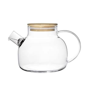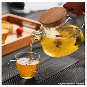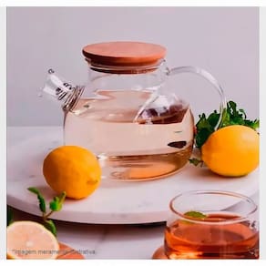 Chaleira de vidro, com tampa de bambu e coador no bico, um luxo para servir chás e águas aromatizadas, o bico auxília no filtro das ervas e pedacinhos de frutas, a jarra complementa a mesa posta ou até mesmo para manter os líquidos em geladeira, pois conta com uma tampa que evita de receber qualquer resíduo ou odor.