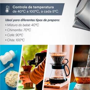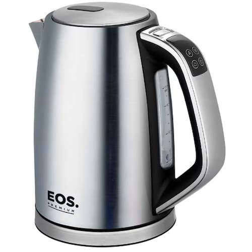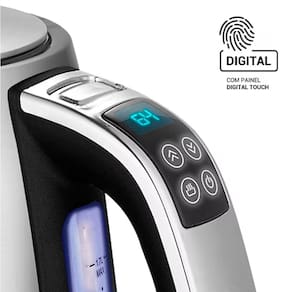 Chaleira elétrica digital EOS Ellegance Platinum Inox com capacidade de 1.8L, potência de 1500W, controle digital touch de temperatura, função Keep Warm e desligamento automático.Características