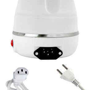 Chaleira elétrica portátil dobrável com corpo em silicone resistente a altas temperaturas e placa de aquecimento em aço inoxidável. Possui desligamento automático ao atingir a fervura.Acessórios