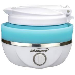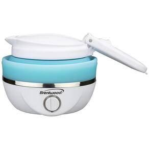 Chaleira Elétrica Brentwood com capacidade de 0,8L, potência de 1200W, corpo dobrável, elemento oculto e design na cor azul.Características