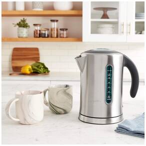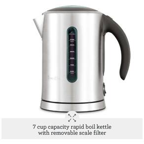 Alça ergo de punho macio com botão de impressão da tampa para enchimento fácil Tampa de abertura suave controlada por almofada com grande janela de visualização evita respingos de água quente As janelas de água permitem que você facilmente quanta água veja o chuveiro Grande capacidade de 1,7 litros, 7 xícaras Elemento oculto de fervura rápida 1500W Base de alimentação multidirecional com zenamento de cabo