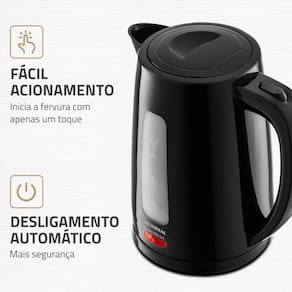 Produto: chaleira elétrica 1,7 litros 1850 watts pratic hot - ce-17 marca: mondial voltagem: 110vdescrição: a chaleira elétrica 1,7 litros 1850 watts pratic hot ce-17 da mondial é perfeita para facilitar o seu dia a dia na cozinha com 1,7 litros de capacidade, preparar bebidas quentes na temperatura ideal ou acelerar o cozimento de alimentos, vai ficar muito mais fácil compacta e portátil, possui fácil abastecimento de água, desligamento automático e alça isotérmica, para mais segurança em sua rotina. Saiba mais sobre a ce-17 da mondial: Capacidade: 1,7 litros a chaleira elétrica mondial aquece a água em poucos minutos e prepara até 7 xícaras de chá de uma vez Versátil: aquece água para preparar café, chá, chimarrão e outros alimentos. Fácil acionamento: inicia a fervura com apenas um toque Visor transparente: melhor visualização durante o preparo. Pode ser Utilizado com pouca ou muita água, de acordo com sua necessidade. Tampa abre-fácil: basta acionar o botão e realizar o abastecimento de água. Portátil: a jarra removível sem fio é ideal para servir à mesa. Alça isotérmica: ergonômica, não aquece e permite o manuseio com mais segurança e conforto. Desligamento automático: o dispositivo de segurança desliga automaticamente após o aquecimento, impedindo que a água ferva até secar. Mais segurança e economia de energia. Porta-fio: mais praticidade na hora de guardar. Lâmpada-piloto: indica o funcionamento do produto. Um ano de mondial: a mondial é a escolha de milhões de consumidores. Mondial, a escolha inteligenteespecificações: modelo: ce-17cor: pretodesligamento automático: simcapacidade em litros: 1,7lmaterial: pptipo de tomada: 10aalimentação: energia elétricapotência: 1850wguarda-fio: nãocomprimento do cabo: 0,85m. Homologação Anatel: 060792000160 Marca: Não Informado