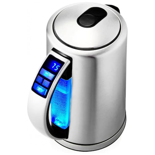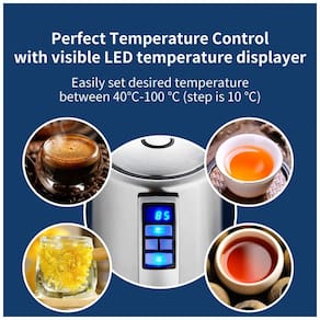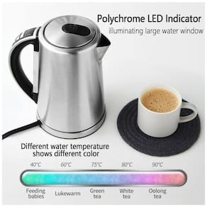 Quando você coloca a chaleira na base de energia, verá a temperatura atual da água no visor digital visível. Você pode parar de aquecer a qualquer temperatura, mesmo que a água não tenha atingido a temperatura de ajuste Função Quente de Manter A chaleira elétrica sem fio de aço inoxidável de 1,7 litro possui 1500 watts com uma função de manter a calma, mantendo a água aquecida na chaleira elétrica por 2 horas Indicador LED policromático A grande janela de água mostra o volume de água fora da chaleira de aço inoxidável, iluminada por cores diferentes quando a água fica com temperatura diferente Controle de temperatura Usando os botões de temperatura de ebulição para cima ou para baixo para definir configurações de temperatura de 10 C a 100 C cada 10 C para fazer uma xícara perfeita de chá Proteção automática contra desligamento e secagem a fervura Quando a água atinge ou é maior que a temperatura desejada, a chaleira muda automaticamente. Se você ligar a chaleira sem água, a proteção para secar automaticamente desligará o aparelho