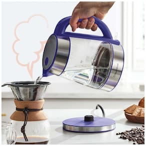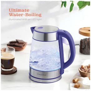 Chaleira elétrica com jarra de vidro, capacidade de 1.7 litros, desligamento automático, potência de 1500W, luz azul indicadora de funcionamento e base giratória 360°.Características