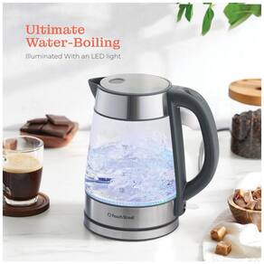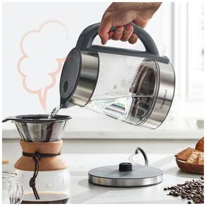 Fervura rápida A água ferve em instantes, uma luz azul iluminando majestosamente a chaleira elétrica. 1.500 watts e um controlador OTTER fornecem velocidade e potência adicionais. Operação segura Uma técnica de desligamento automático desliga a chaleira de água quente assim que a água ferve para evitar fervura a seco. O elemento de aquecimento oculto garante que nenhuma toxina entre na água e a alça permanece fria ao toque para um manuseio . CUIDADO Não despeje com a tampa aberta Base giratória Com uma base giratória de 360, você pode acessar facilmente a caldeira de todos os ângulos. Fora da base, a chaleira é totalmente sem fio para um vazamento suave. Guarde cuidadosamente o cabo abaixo da base em um slot de zenamento especialmente projetado. Design ergonômico Esta chaleira elétrica possui um filtro de malha embutido que permite colocar saquinhos de chá ou frutas na água apenas com a água passando. A parte superior abre com o toque de um botão e a boca larga facilita o reabastecimento e a limpeza. Com uma base giratória de 360, você pode acessar facilmente a caldeira HO de todos os ângulos. Fora da base, a chaleira é totalmente sem fio para um vazamento suave. Guarde cuidadosamente o cabo abaixo da base em um slot de zenamento especialmente projetado. Vidro durável Com atraente vidro borossilicato e aço inoxidável 304 escovado, o aquecedor de água quente durará muitos anos, adicionando um charme único à sua cozinha. O exterior é brilhantemente transparente e sem manchas, com medidas marcadas para um vazamento preciso.