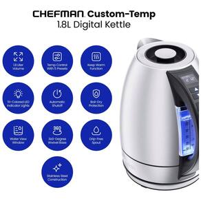 FERVER COMO NUNCA ANTES A busca pela chaleira elétrica definitiva chegou ao fim. A Chaleira Elétrica Chefman com Controle de Temperatura tem a velocidade necessária para preparar 1,8 litros de um chá da manhã bem quente. Com a tecnologia de fervura rápida, você pode aquecer duas xícaras de água em apenas três minutos. ESCOLHA SUA PREDEFINIÇÃO Chefman torna sua xícara de chá totalmente livre de desconforto. Sete predefinições integradas permitem que você simplesmente selecione seu tipo de chá favorito e a chaleira irá ferver até a temperatura perfeita. Escolha entre ervas, preto, verde, branco, oolong, e esta chaleira elétrica fará o resto. MASTER TEA TIME Luzes brilhantes e tricolores indicam energia, aquecimento e mantêm se aquecido para que você possa ferver até a perfeição absoluta. A interface intuitiva está embutida na alça para uma experiência perfeita do início ao fim. O CONTROLE MÁXIMO Potência e precisão agora estão incluídas na chaleira mais conveniente do mundo. A abertura da tampa de 90 e a base giratória de 360 tornam mais fácil derramar e encher, e uma janela de visualização ultra clara permite que você observe a água enquanto ela ferve Marca: Não Informado
