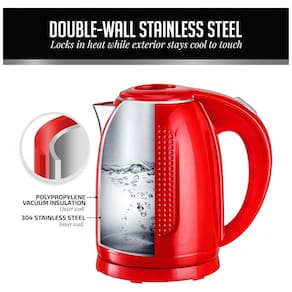 Interior de aço inoxidável de parede dupla Camada com duas folhas de aço inoxidável para manter a temperatura por um período mais longo, mantendo o exterior da chaleira confortável ao toque. Dupla finalidade Esta chaleira não é apenas para ferver, mas também pode ser usada como jarra para suas bebidas frias. Também pode ser para outras bebidas, como sucos e muito mais. Eficiência Energética Alimentado por 1100 Watts 120 V, pode ferver até 1,7 litros de água em apenas alguns minutos, ajudando a economizar mais eletricidade em comparação com o uso de chaleiras tradicionais. Proteção de desligamento automático e fervura Projetado para evitar contratempos com uma função de desligamento automático que é ativada quando atinge o ponto de ebulição ou quando não há água na chaleira. Ele também tem uma luz indicadora de energia para que você possa verificar se a chaleira está ligada rapidamente