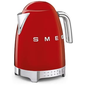 Chaleira elétrica SMEG KLF04RDUS, 1.7L, com design retrô e tecnologia moderna. Possui 7 níveis de temperatura, tampa de abertura suave e base giratória 360°.Características