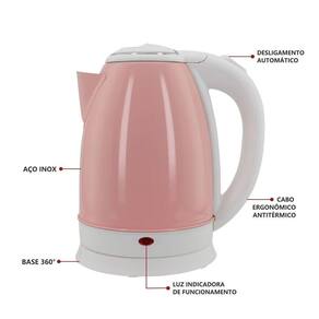 Chaleira elétrica com capacidade de 1,8L, feita em aço inoxidável na cor rosa. Possui potência de 1000W e opera em 127V, com desligamento automático ao ferver e aquecimento rápido.Acessórios