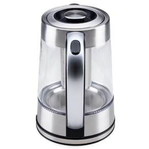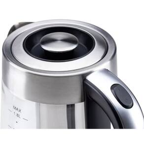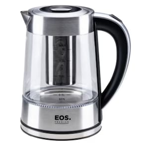 Chaleira elétrica EOS Tea com corpo em inox e vidro, potência de 1000W, capacidade de 1.8L, infusor embutido, base giratória 360°, desligamento automático e luz indicadora de funcionamento.Características