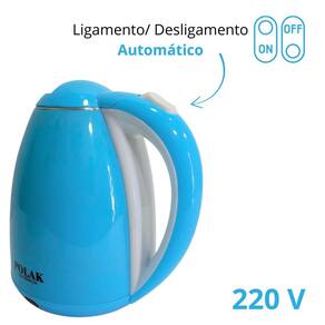 Chaleira elétrica 2l em aço inox base rotatória 7908256530032 Cor: azul Voltagem: 220v Leve mais praticidade para a sua cozinha com a chaleira elétrica de 2 litros ideal para esquentar água de forma rápida e segura, ela é perfeita para preparar chás, cafés, instantâneos e muito mais. Com design moderno e capacidade generosa de 2 litros, atende perfeitamente famílias, escritórios ou quem busca agilidade na rotina, oferecendo flexibilidade para uso em qualquer ambiente. Seu funcionamento é simples e eficiente, com desligamento automático, base giratória e indicador de funcionamento que garantem maior segurança e comodidade. Por que comprar com a imports - enviamos em até 24 horas; - produto de ótima qualidade; - produto testado e muito bem embalado para chegar em perfeito estado; - foco total no cliente. Informações importantes: - modelo: chaleira elétrica - material: inox e plástico - tamanho: 22x22 cm - capacidade: 2 litros - interior de aço inoxidável - liga/desliga com luz indicadora - cabo de toque frio firme e estável - proteção para ferver a seco - melhor conservação da temperatura - desligamento automático ao atingir a fervura - tampa articulada com função de trava Atenção: - leia atentamente as informações da caixa antes de utilizar o produto para melhor desempenho. Marca: Não Informado