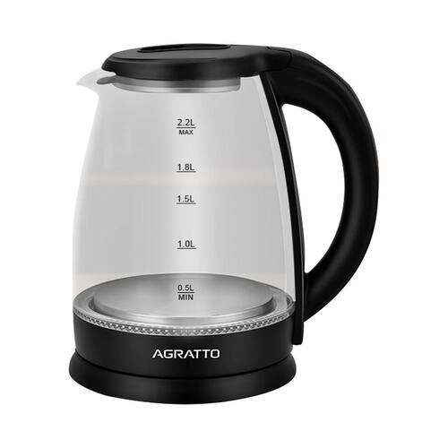 Chaleira elétrica de vidro com sistema elétrico que não tem contato com a água, base de contato separada, led azul que acende durante o uso, trava de segurança, alça isotérmica e desligamento automático.Acessórios
