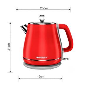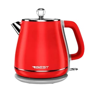 Chaleira elétrica com jarra de 1,8 litros, potência de 1200W, desligamento automático, luz indicadora de funcionamento e tampa removível. Design moderno na cor vermelha.