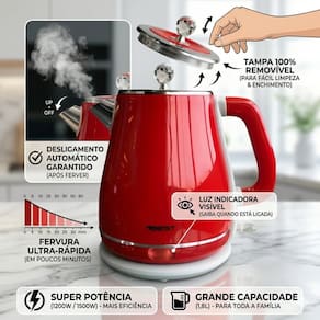 Chaleira elétrica com design moderno e vibrante na cor vermelha. Possui 1200W de potência, capacidade de 1,8 litros e desligamento automático para maior segurança. Ideal para aquecer água rapidamente para diversas bebidas e alimentos.Acessórios