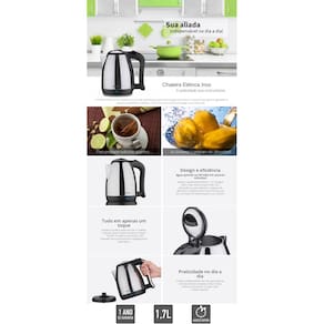 A Chaleira Elétrica Cadence 1,7L Inox é ideal para o preparo de cafés e chás sem que você precise utilizar o fogão para isso. Facilita a rotina do dia a dia, inclusive do escritório, auxiliando também no preparo de refeições rápidas como sopas instantâneas e molhos. Aqueça rapidamente 500ml a 1,7L de água para o que você precisar! Café, chá, chimarrão ou para adiantar o preparo de alimentos. Acabamento em aço inox que vai dar um toque de requinte para a sua cozinha.