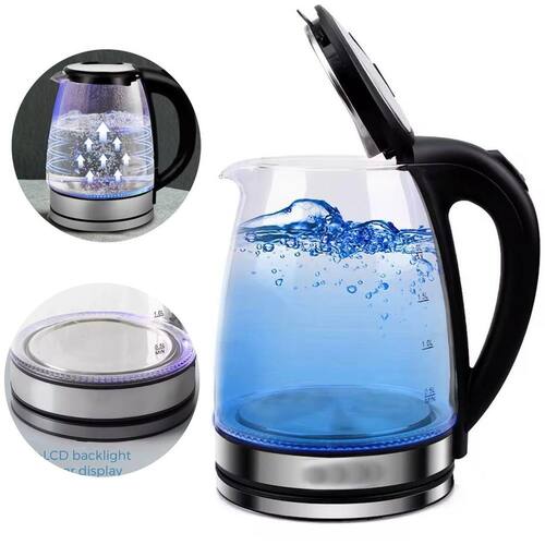 Chaleira elétrica de vidro temperado com capacidade de 2 litros e potência de 1000W. Possui desligamento automático, base rotacional 360º e iluminação LED.Acessórios