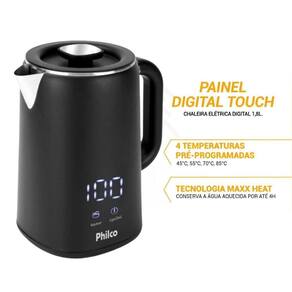 Chaleira Elétrica Digital Philco PCH18B com capacidade de 1,8 litros, painel digital touch, controle de temperatura ajustável de 45°C a 85°C, tecnologia Maxx Heat para manter a água aquecida por até 4 horas, acabamento interno duplo, jarra sem fio com base giratória 360°, tecnologia Boil Dry e potência de 1250W.Vendido e entregue por Olist SP