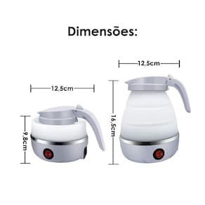 Chaleira elétrica dobrável com jarra e bule em silicone. Potência de 600W e capacidade de 600ml. Voltagem 110V. Design portátil e compacto para fácil armazenamento.Acessórios