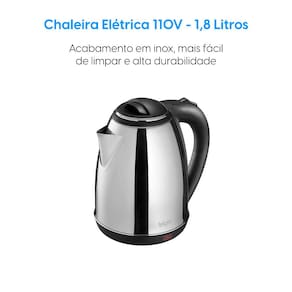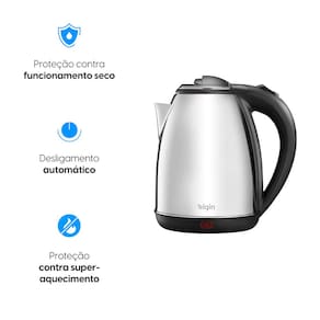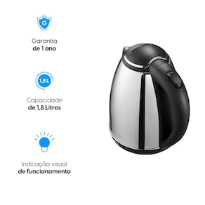 -Com desligamento automático; -Com lâmpada piloto; -Capacidade do reservatório de água: 1,8 litros; -Contém fio na base da chaleira.Características