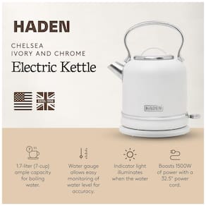 A chaleira elétrica Haden Chelsea Ivory & Chrome modelo 75160 foi desenvolvida para aquecimento de até 1,7 litro de água em uso doméstico, atendendo preparo de chá, café e outras bebidas quentes. A estrutura em aço inoxidável com acabamento esmaltado na cor marfim e detalhes cromados integra base com conexão 360°, permitindo posicionar a chaleira em qualquer orientação.