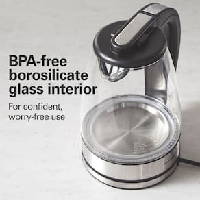 Hamilton Beach Chaleira elétrica de 1,7 L, caldeira de água e aquecedor, indicador de LED, filtro de malha embutido, desligamento automático e proteção contra fervura, sem fio, vidro transparente - Ebulição rápida com 1500 watts — Esta chaleira elétrica de vidro ferve até 1,7 litros de água mais rápido do que um micro-ondas e mais segura do que uma chaleira de fogão. Faça uma rápida xícara de chá ou café francês a qualquer momento sem a longa espera — perfeito para manhãs agitadas. - Interior de vidro borossiliciado e livre de BPA: Se você estiver fervendo água para bebidas quentes ou fazendo um lote rápido de macarrão instantâneo, o interior é feito de paredes de vidro borossilicato sem BPA e uma placa de aquecimento de aço inoxidável para uso confiante e sem preocupações. - Desligamento automático para tranquilidade. A chaleira elétrica Hamilton Beach desliga automaticamente quando chega a ferver. A proteção contra fervura evita que a chaleira queime se a água ficar baixa. - Fica ótimo na cozinha: esta chaleira elétrica de vidro fica ótima na bancada da cozinha. As luzes LED azuis iluminam quando a água está aquecendo para um brilho azul suave. - Serviço prático sem fio. A chaleira elétrica sem fio sai da base para servir água quente na mesa ou em qualquer lugar em que você esteja servindo bebidas quentes ou precise de água fervente.