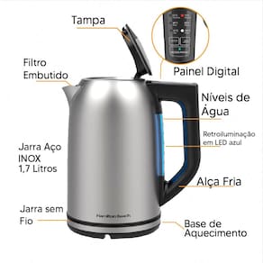 Com 1500W (127v) e 1850W (220v) de potência, a chaleira aquece a água de maneira rápida e eficiente, economizando tempo e energia.