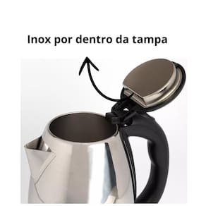 Chaleira elétrica com capacidade de 1.8 litros, potência de 1500W e voltagem 220V. Feita em aço inoxidável resistente à corrosão, com base giratória 360°, resistência oculta e desligamento automático.Acessórios