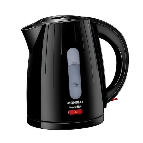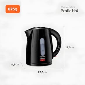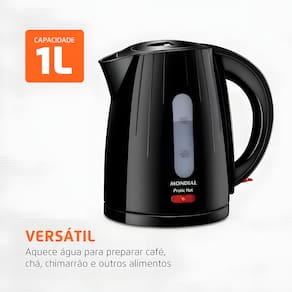 Chaleira Elétrica Mondial CE-07 Pratic Hot com capacidade de 1 Litro, potência de 1200W, desligamento automático, lâmpada piloto e filtro coador.Características