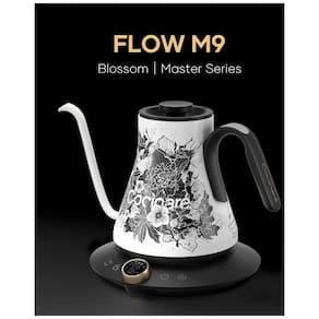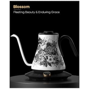 Chaleira elétrica com bico em pescoço de ganso para controle preciso de fluxo. Corpo interno e externo em aço inoxidável. Base eletrônica com controle de temperatura e função manter aquecido. Acabamento Blossom (preto e branco).Acessórios